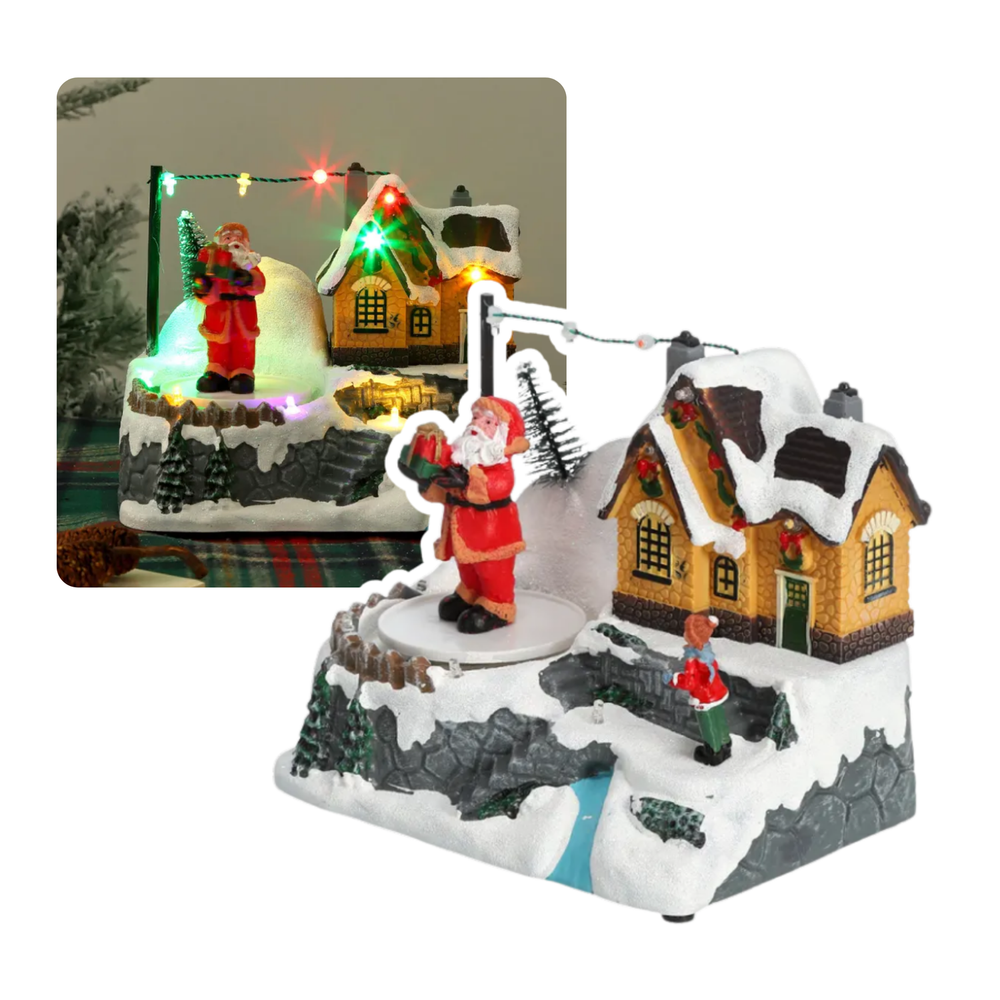 Casita navideña con luces led y música Dale vida a tu decoración navideña con esta hermosa casita iluminada. Fabricada en resina y plástico, presenta una encantadora escena de Papá Noel con un duende en un paisaje nevado lleno de detalles. Sus luces LED de colores y la música integrada crean un ambiente mágico y festivo, ideal para mesas, estanterías o como centro de decoración. Funciona con USB (incluido) o con 3 pilas AA (no incluidas)