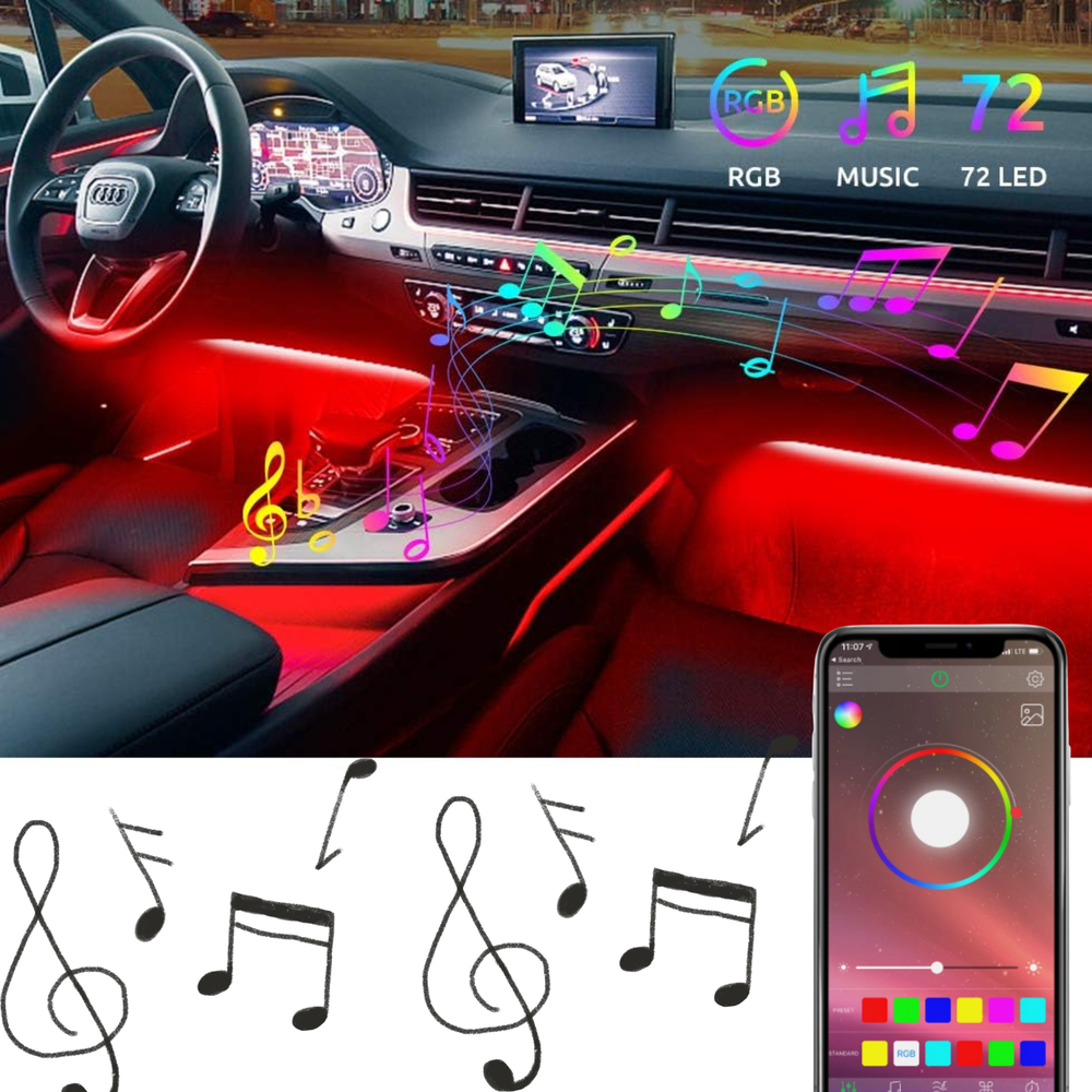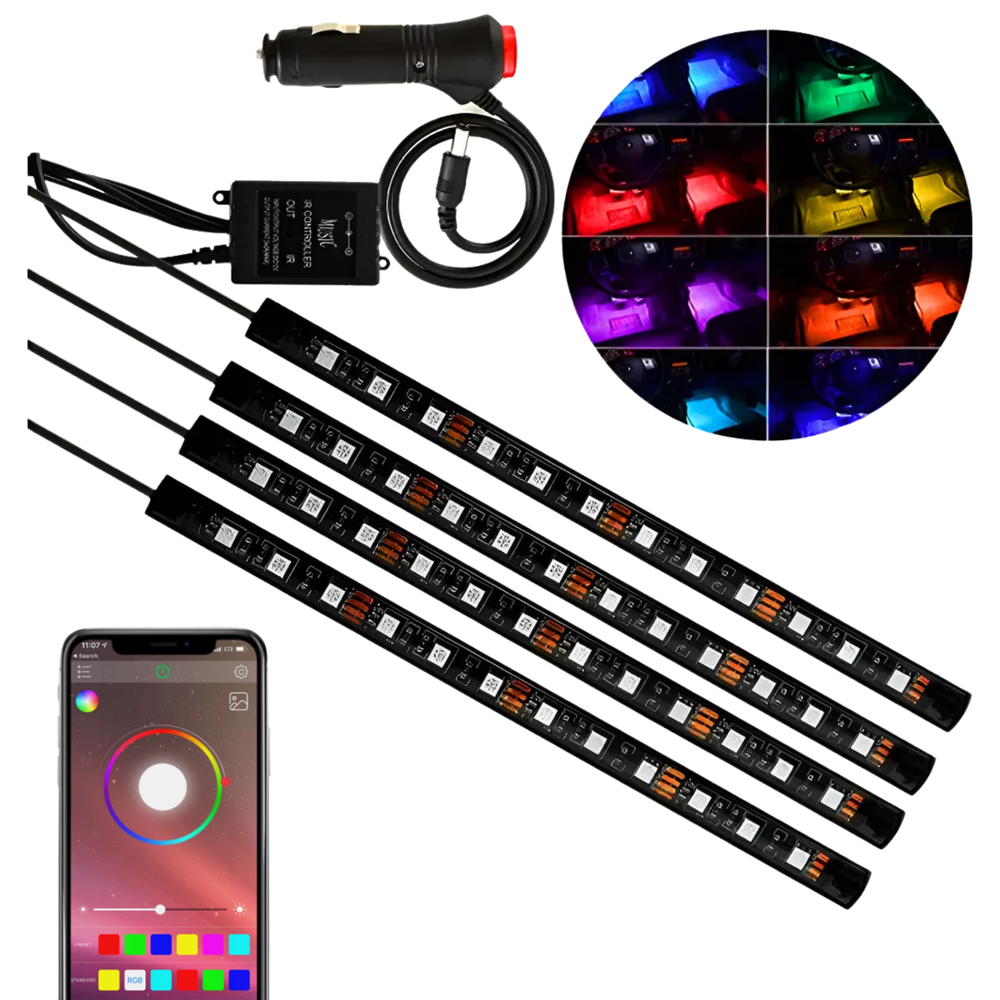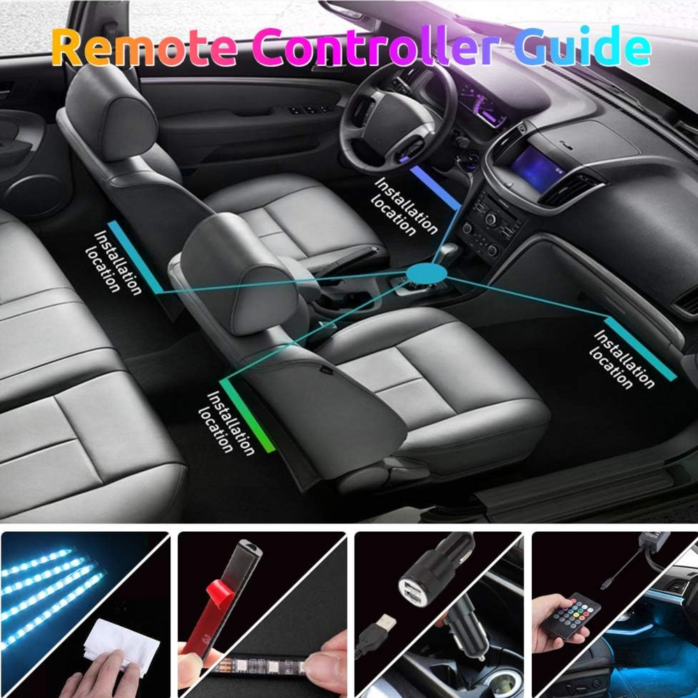 Fácil de instalar: enchufar y usar. En primer lugar, conecta el encendedor de cigarrillos incluido en el paquete de accesorios, luego retira la doble cara 3M detrás de cada tira de luces LED del coche y aplícala debajo de los asientos o debajo del parachoques (por supuesto, puedes ponerlo en cualquier lugar que se pueda cargar con puerto USB). Por último, utiliza el mando a distancia para elegir el modo o el brillo que te gusta, luego disfruta de estas luces LED interiores para coches.