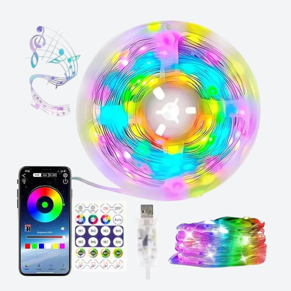 Esta cadena de luces activada por voz está equipada con un controlador de aplicación Bluetooth de 24 teclas, que se puede controlar por teléfono móvil y control remoto. Hay botones en el controlador, que también pueden controlar la tira de luz. Este producto puede ajustar la luz, el color, el tiempo, la música y otros modos. La lámpara en sí tiene un chip IC incorporado, que puede realizar efectos de control de punto de agua en zigzag, salto y persecución.