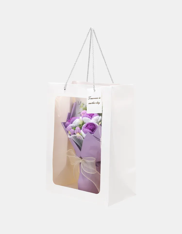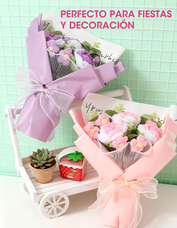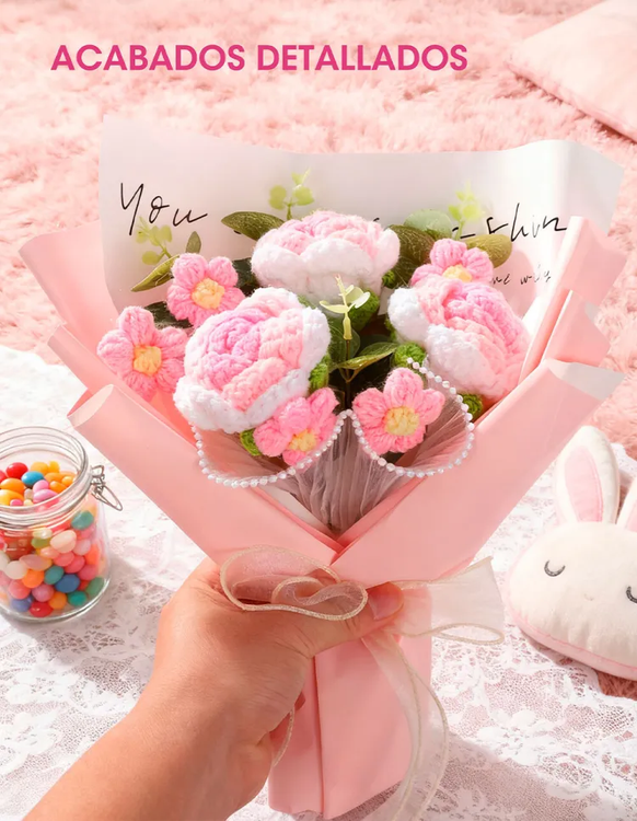Ramo decorativo compuesto por 3 rosas tejidas, acompañados de 5 flores pequeñas y hojas verdes. Ideal para decorar espacios, regalar o aportar un detalle acogedor y artesanal al ambiente.