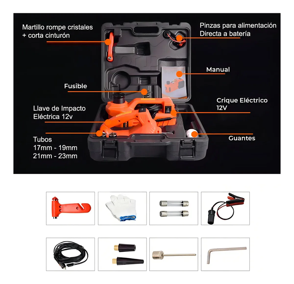 Incluye: Criquet eléctrico + Inflador, que se conecta al encendedor o a la batería y permite levantar un vehículo de hasta 5 Toneladas con solo presionar un botón. El compresor permite inflar el neumático rápidamente. Pistola de Impacto, para sacar y colocar los tornillos del neumático de manera rápida, incluso cuando están fuertemente enroscadas.